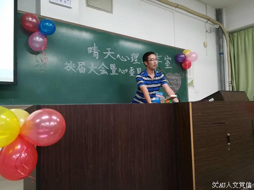 视频播放结束后,由工作室指导老师关磊老师致辞。关磊老师首先对晴天过去一年的优秀表现给予了充分的肯定和赞扬,同时也对晴天过去一年的不足提出意见和建议。最后,关磊老师还对全体成员提出了要求,并给予厚望,他希望工作室的全体成员在新的一年里继承为同学们全心全意服务的优良传统,积极开展各项活动,为学院学生心理健康作出更大的贡献。