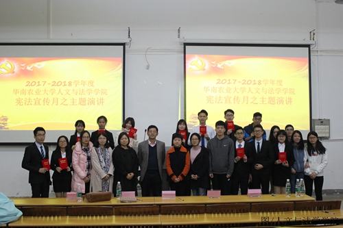 宪法是我国的根本大法,具有最高法律效力。它书写着公民的义务和权利,规定着国家各项基本制度和根本任务,是一切法律的根本依据。为推动宪法知识普及,引导学子树立法律意识,12月20日晚,校党委宣传部和人文与法学学院联合举办的普法活动月主题演讲比赛于人文与法学学院院楼101室顺利举行。华南农业大学校党委宣传部李敏老师、人文与法学学院法律系左卫霞老师、刘雪梅老师以及学院辅导员成桂平老师、施煜老师、黄子倩老师担任本次比赛评委。