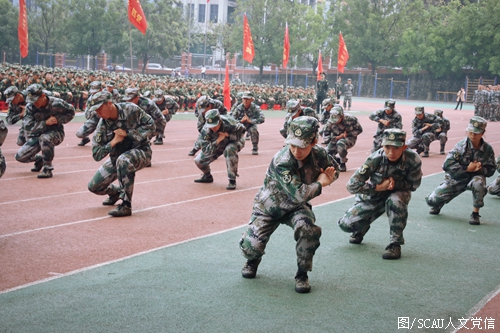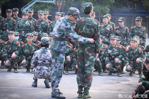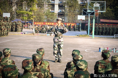 人文学子在教官铿锵的口号的指挥下学习基本的动作,如起立、蹲下、转身和鼓掌,训练教官由简到繁、由易到难、由分解到连贯对每个动作要领进行了细致的讲解和示教,及时调整训练中存在的动作不规范,着装不规范等细节问题。在休息期间,教官与学生进行互动,教学生唱军歌,不同排之间互动连连,有节奏的掌声和激情的歌声消除了军训的陌生和不安,专注和坚持是他们对于军训第一天的回答。