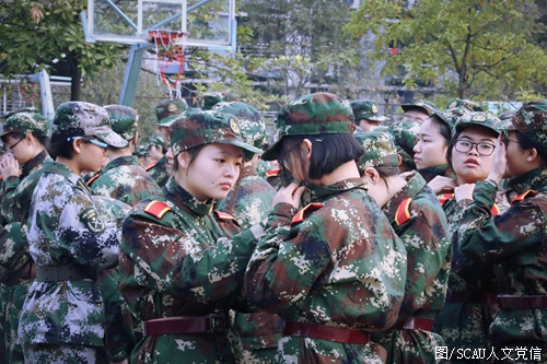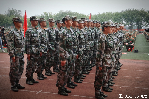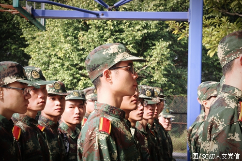 在会场认真听讲的人文与法学学院所属的四团十三营在会后获得赞誉,而他们从清晨起就已经做好了军训的准备,在朝阳中期待着和教官的第一次会面。“当你穿上了军装,就是要朝着合格的军人形象前行,帽子戴正,腰带系紧,衣角拉直”教官们一边讲解,一边给同学们纠正,绿装红颜,英姿飒爽,堂堂男儿,整装出发,经过教官的指导下,大家不仅以一种全新的姿态迎接军训,更是明白这身军装于自身的意义,纽扣肩章,俱是豪情,迷彩军绿,熔铸军魂。