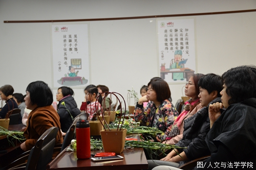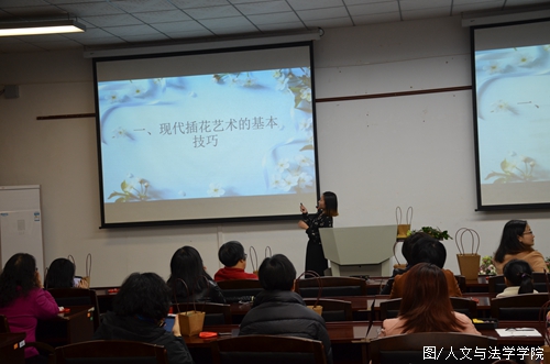 本次花艺主题活动分理论讲授和现场制作两部分。花艺师先从理论上对什么是花艺、花艺的起源、种类、搭配以及如何制作花艺作了详细的讲解。在充分阐明花艺的相关理论之后,花艺现场教授老师们动手制作花艺作品。老师们沉浸在花艺的制作过程中,不时传来惊喜的欢笑声,更有老师赋诗一首,将自己的花艺作品赋上美名,合影留念。