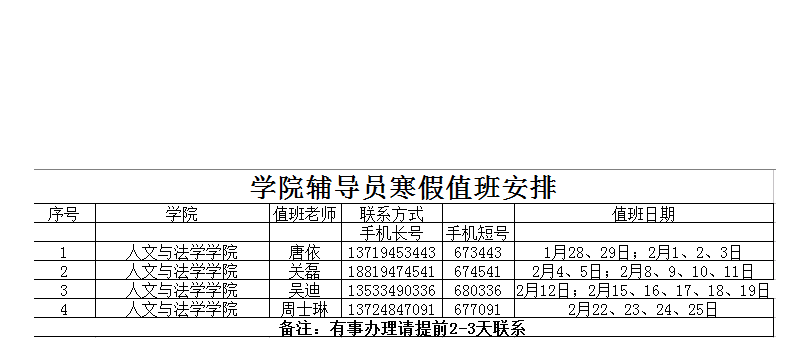 人文与法学学院寒假辅导员值班安排