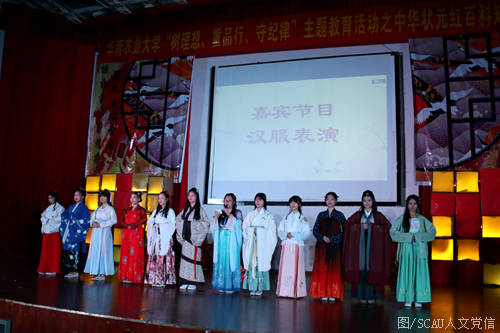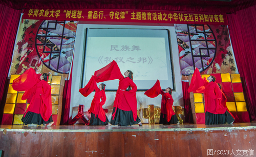晚会现场还穿插了汉服表演、民族舞等展示中华优秀传统文化的节目。云想衣裳花想容,晚风拂槛露华浓,由我校汉服协会带来的汉服表演展示了深衣、对襟半臂襦裙、齐胸襦裙等十余套华美的汉服,为现场观众展示了中华传统服饰文化的独特韵味。一袭水袖,红衣翩翩,民族舞《礼仪之邦》更为激烈的决赛增添了别样的诗意与韵味。人文歌队带来的歌曲《故城》则以优美的歌声吟唱古朴优雅的历史文明。