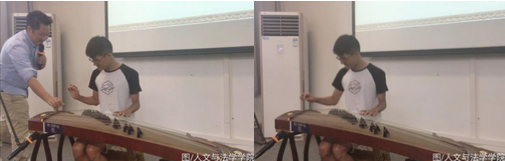 Combining theoretical learning with music appreciation, the laboratory alsolaunched relevant practical courses. The lab invited guqin expert liuyonggang to carry out several practical exercises for the students,in which the students learned the basic fingering of guqin performance and learned to play a piece of music. Although theactivity space is small and the number of Musical Instruments islimited, students still take turns to practice the basic skills they have learned in the laboratory after class and record video assignments.
