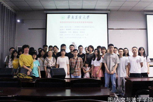 At10 am on May 31, 2019, in room 115, building 7, school of humanitiesand law, south China agricultural university, the lecture series of Chinese ritual and music culture laboratory of philosophy departmentstarted as scheduled. This lecture has invited the guangzhou Chinese orchestra erhu player teacher li hanhui, guqin teacher chiba, flutexiao teacher huang zi hua, and guitar teacher zhou jin luo and otherguests. The lecture was lectured by teacher li hanhui. With the theme of "overtones", a unique music appreciation meeting of erhuensemble was held. The lecture was attended by some faculty members,class 2017 and class 2018 students of philosophy department, andother audience members. Professor gao limei of philosophy department presided over the lecture.