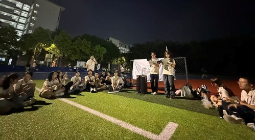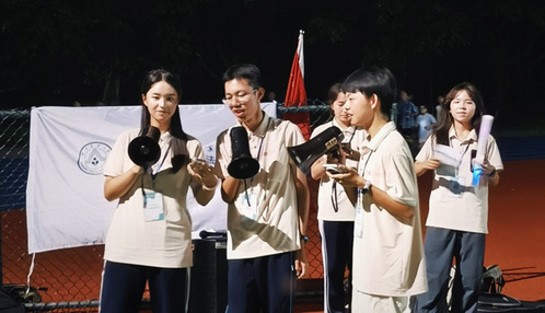师生互动与才艺表演是当晚另一大亮点。歌曲《歌唱祖国》的大合唱庄重而热烈;文震彪、邱林钰泓等同学的器乐与歌唱表演和谐悦耳,赢得满堂喝彩。在互动环节,郑宇畅、黄锴铖、陈雅茵等多位同学更是通过即兴赋诗、歌舞等多元形式,不断点燃现场气氛。在动人的歌声中,师生共同挥舞荧光棒,齐声高唱《海阔天空》《当》等经典曲目,点点星光与青春歌声交织,以欢乐点亮了启林南操场。